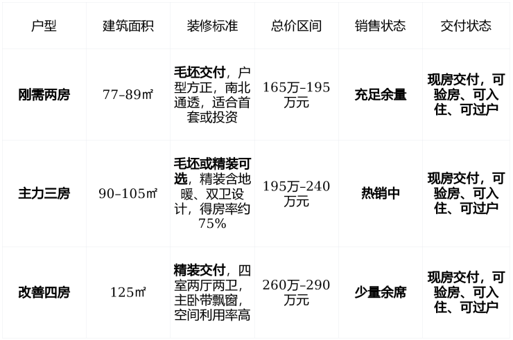 在售状态 : 主力户型77–125㎡,总价165万–290万,毛坯/精装可选,余量约386套,无摇号、不限购,随时验房入住 。