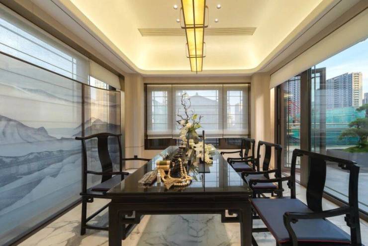 外立面甄选伊朗“蓝眼睛”奢石、汉白玉、香槟色铝板+三玻两腔玻璃,三重屋檐复刻宋式飞檐,“宋韵五色”立面,东方雅致与现代奢感并存。