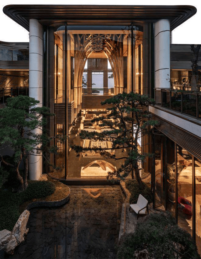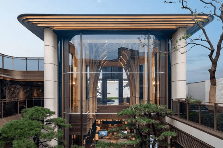 中央庭院以《溪山行旅图》《四景山水图》为蓝本,打造15米高差立体园林;