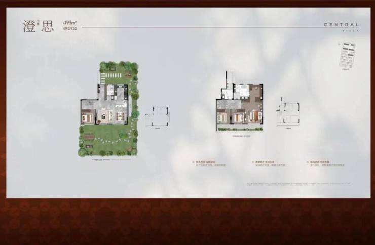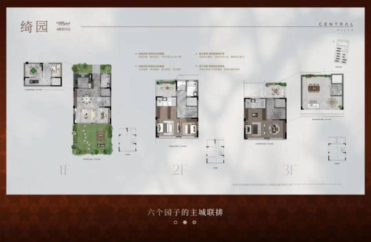 建面约195㎡联排,4房3厅4卫,客厅连接庭院在视觉上延伸空间,另含约55㎡私家庭院与约89-98㎡拓展空间,可根据需求打造为儿童乐园、茶室等多元化空间。