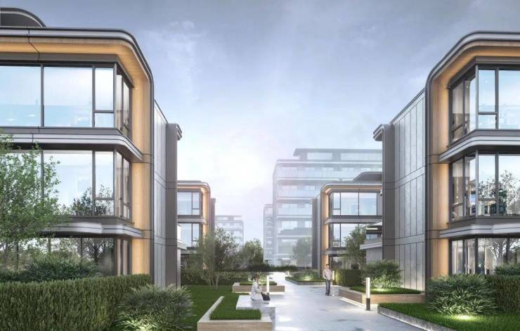 项目联排与叠墅的外立面均采用米白色铝板+深灰色铝板+香槟金铝板+浅灰色仿石涂料+金属格栅+深灰色仿石涂料,搭配大面积落地玻璃,尽显高端品质。