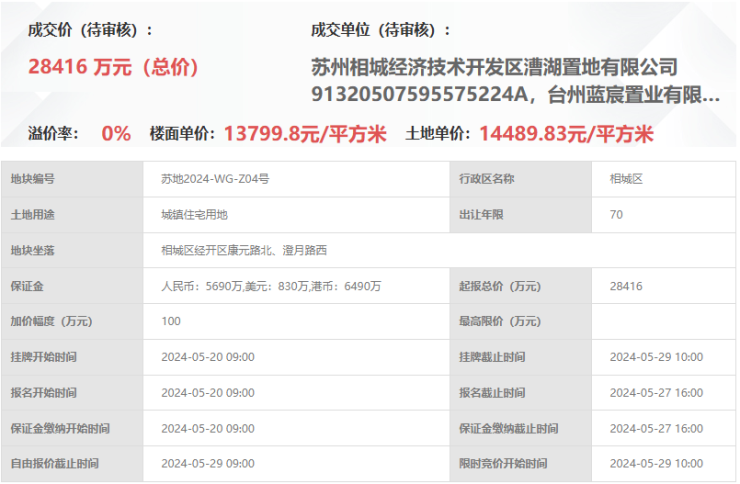 满园,即漕湖置地元和4号地块项目,位于相城区经开区康元路北、澄月路西,由漕湖置地&蓝宸置业&旭辉建管以底价28416万元竞得,成交楼面价为13800元/㎡。