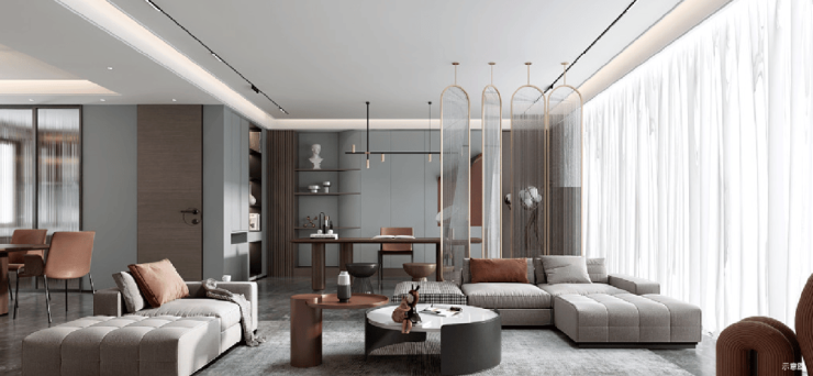 客厅标准开间约4米,整体可利用的空间做到了最大化,搭配全景落地窗,极大的提升生活品质。