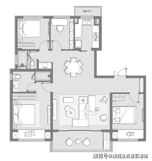 四个卧室如同四叶草的叶片一般舒展于四个方位,相互贯通又独享私密。一个房间给父母,一个房间做主题儿童房,还有一间奢阔主卧套房犒赏主人,尺度感和空间感拉满,以客厅作为连接,满足三代人的生活所需,让生活纵享私密的同时,更有温度。老人品茗下棋,孩子摆弄玩具,一家人各得其乐。