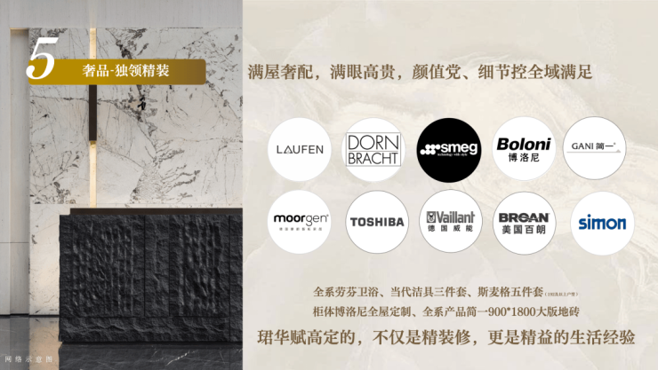 荟萃斯麦格、劳芬、当代、博洛尼……等进口国际奢装品牌,细节考究,入户智能门锁+全屋WIFI,全屋智能化控制面板等智奢标配,只为更质感人居。