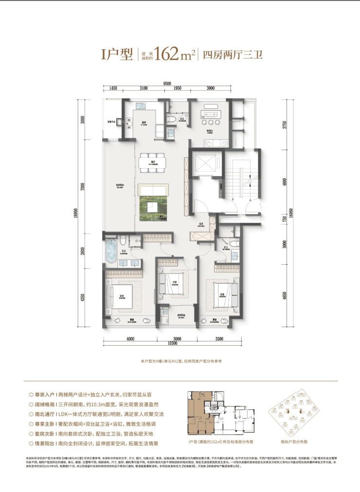 建面约164㎡大宅:四开间朝南,约13.8米南向采光面,主卧套房带独立衣帽间与卫浴,改善首选