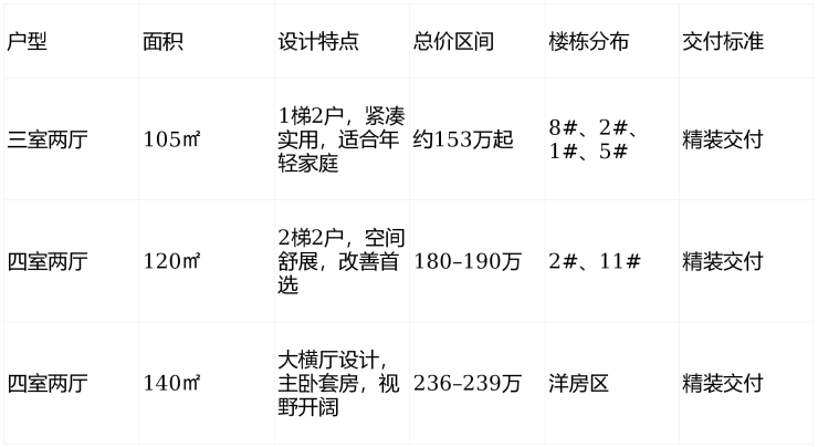 在售状态:仍有尾盘在售,主力户型为105㎡、120㎡、140㎡,精装交付,总价约153万起。