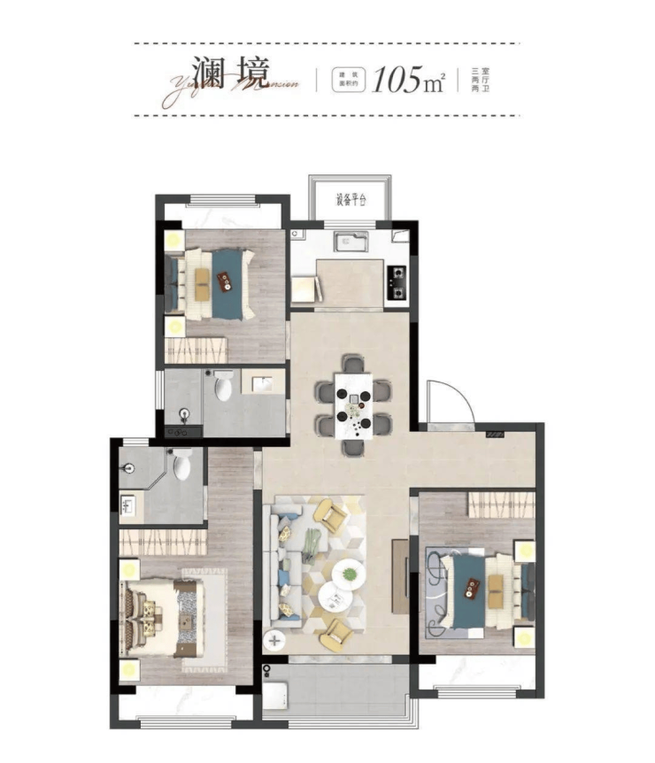 主力户型105-140㎡三居和四居,全系双卫设计,动静分区。