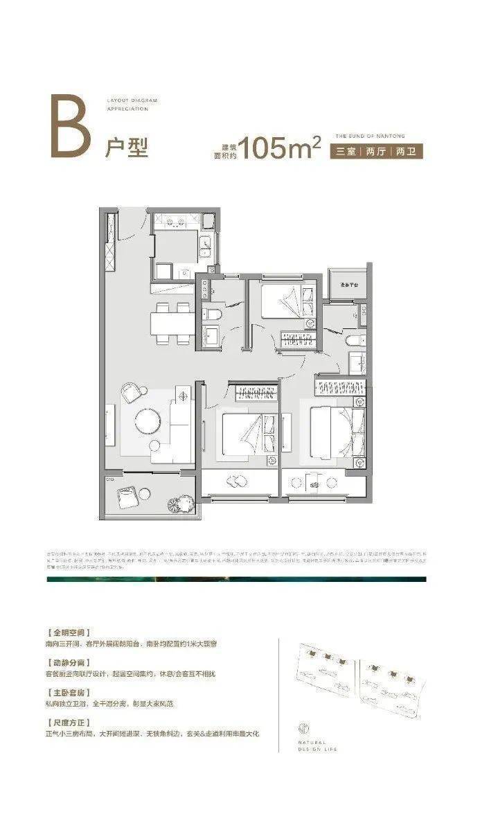户型鉴赏:建面约105㎡ 三房两厅两卫