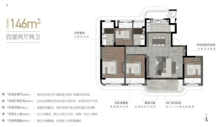 空间设计:全系四开间朝南,南北通透,客厅与阳台一体化设计,最大面宽近7米,采光与视野行业领先。