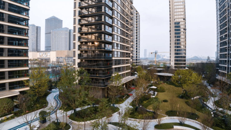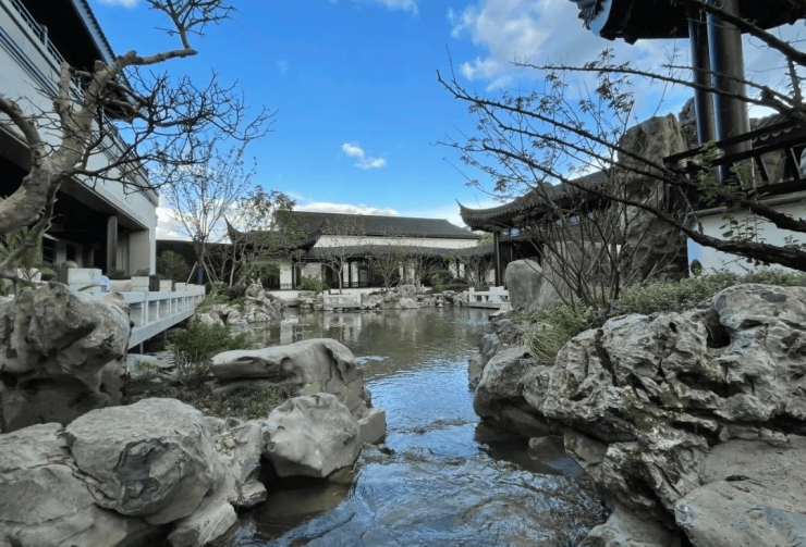 社区园林:苏式院落风格,水系、廊桥、花木错落,打造“离尘不离城”的江南意境