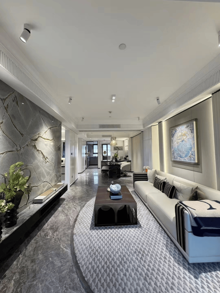 全屋配备恒温恒湿新风系统、AI智能安防、语音控制照明与窗帘、地暖+中央空调联动控制,实现“无感舒适”。别墅区还预留智能家居中控接口,支持未来全屋AI升级。