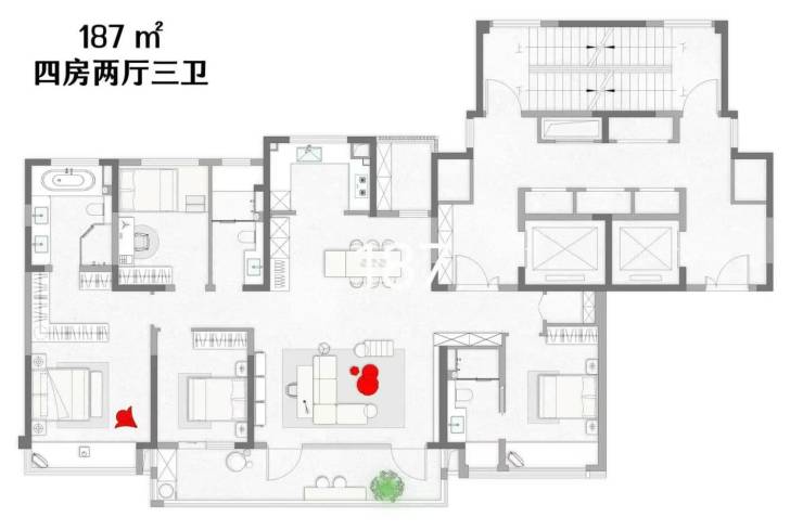 【建面187㎡4居】900.0-1000.0万-分布于15幢 6幢 ,2梯2户,层高3.00米,总楼层25F