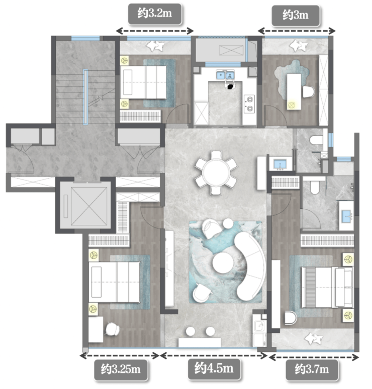 四个卧室分布在户型四角,每个家庭成员都能拥有独立的空间,互不打扰,充分尊重每个人的私密性需求。