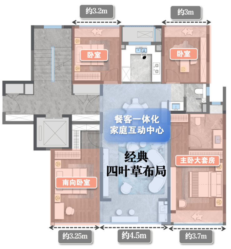项目没有做横厅而是选择“竖厅”格局,搭配非常经典的四叶草布局。