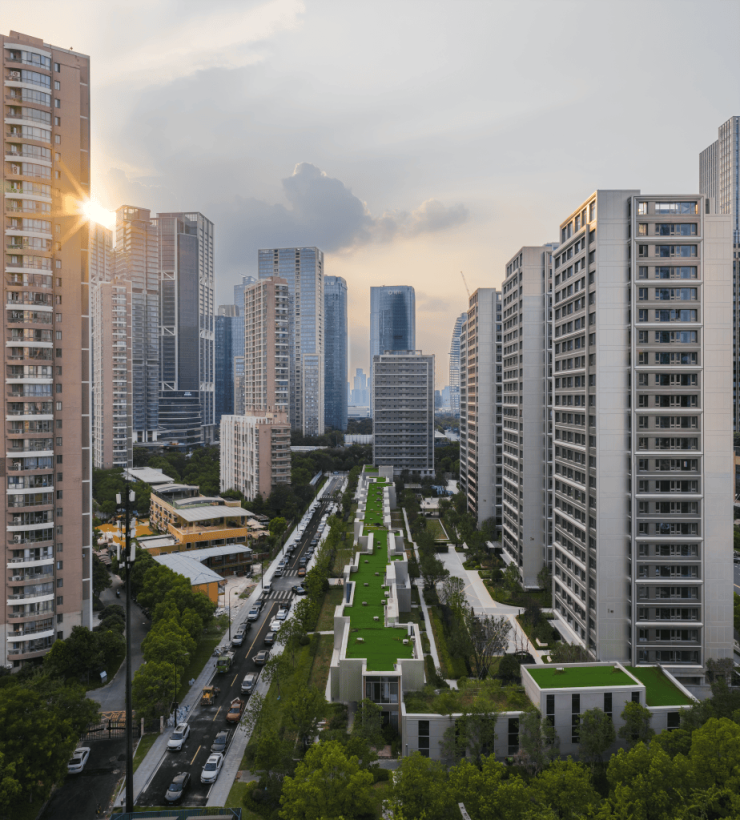 地块虽处奥体繁华心脏,但三面临路,环境喧嚣。设计团队以“外御喧嚣,内享静谧”为核心理念,采用内向围合的规划策略。
